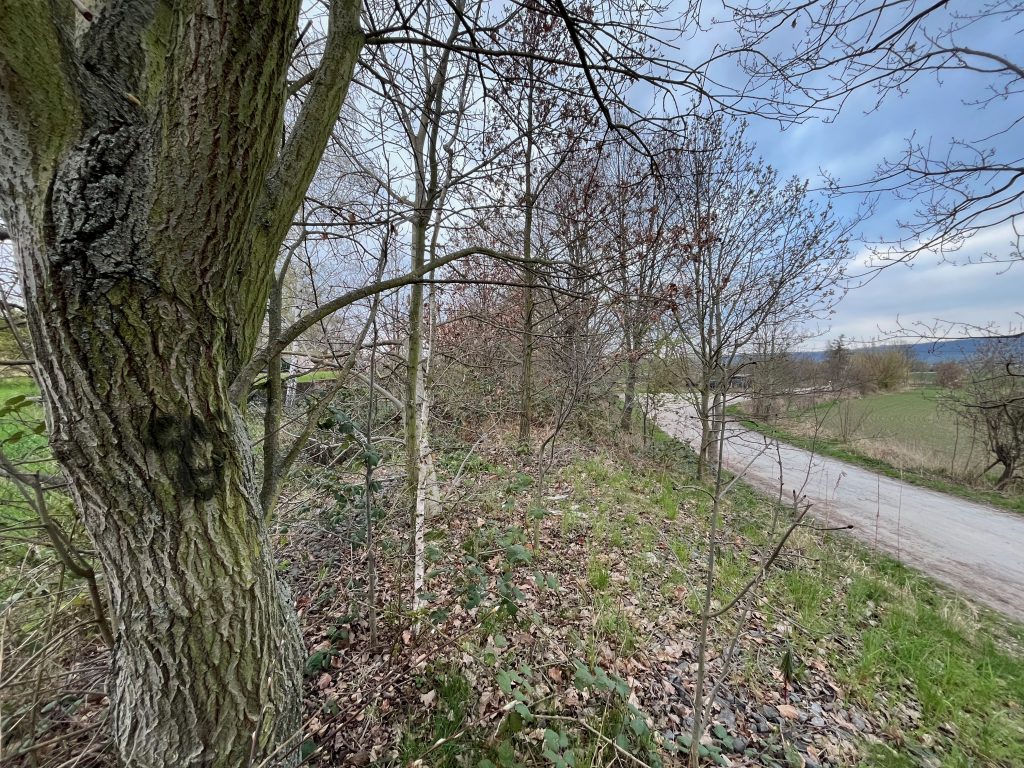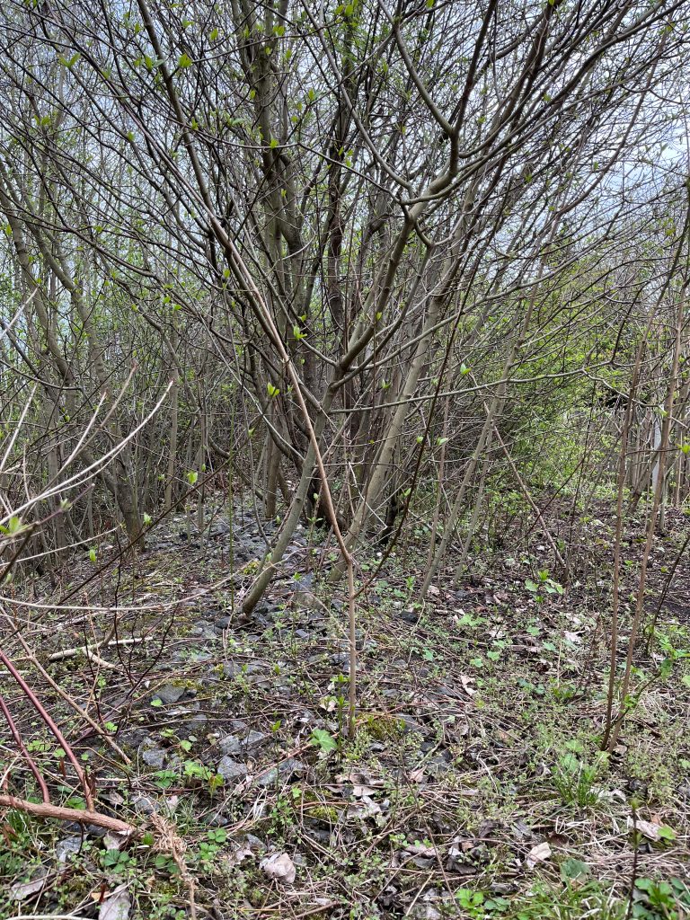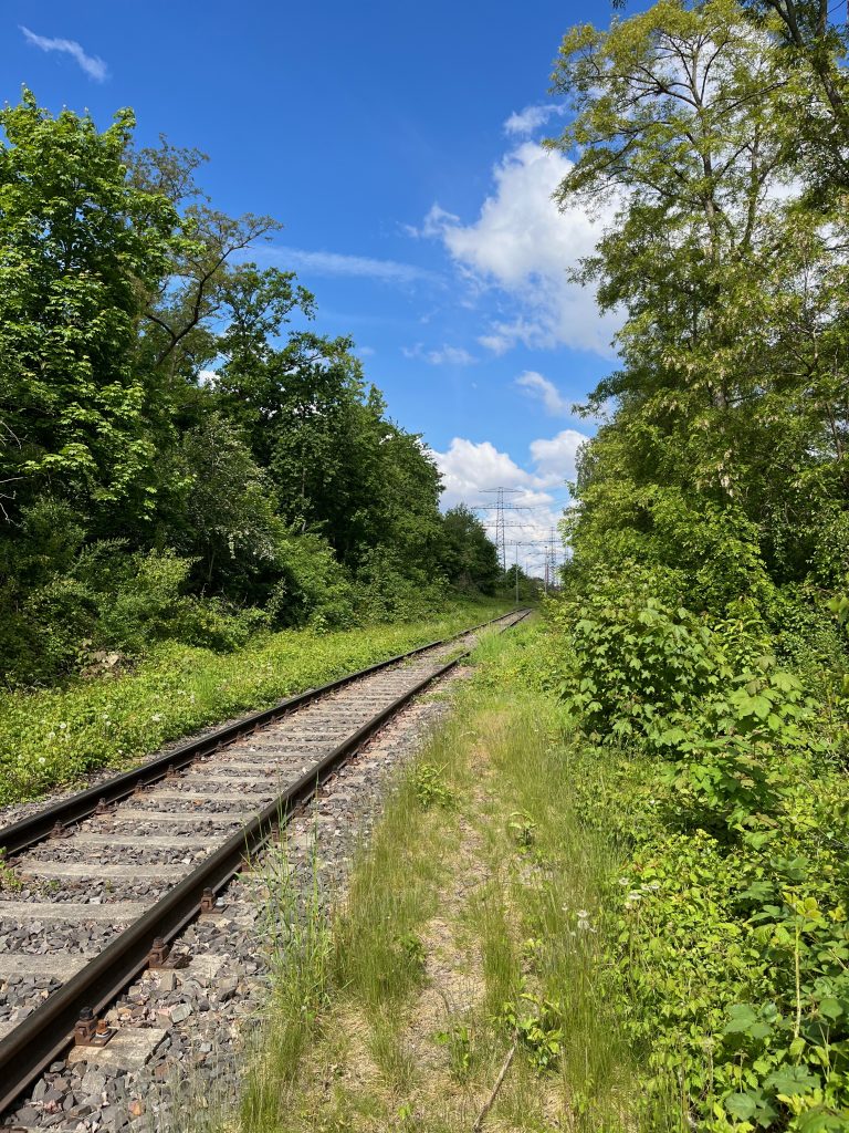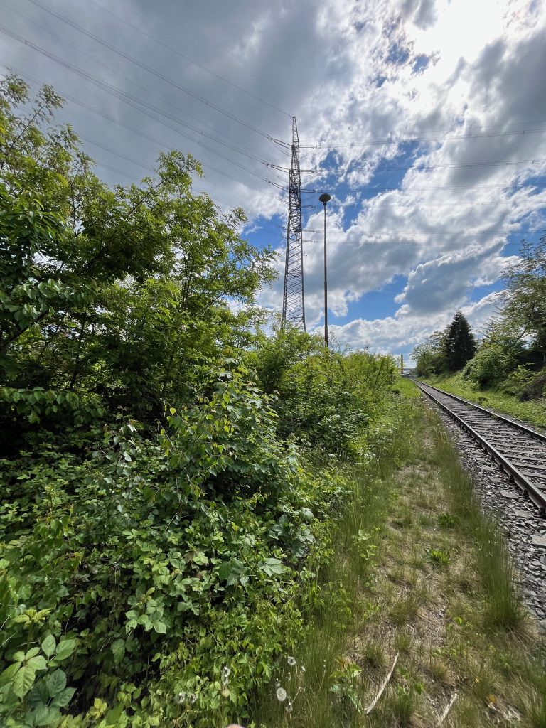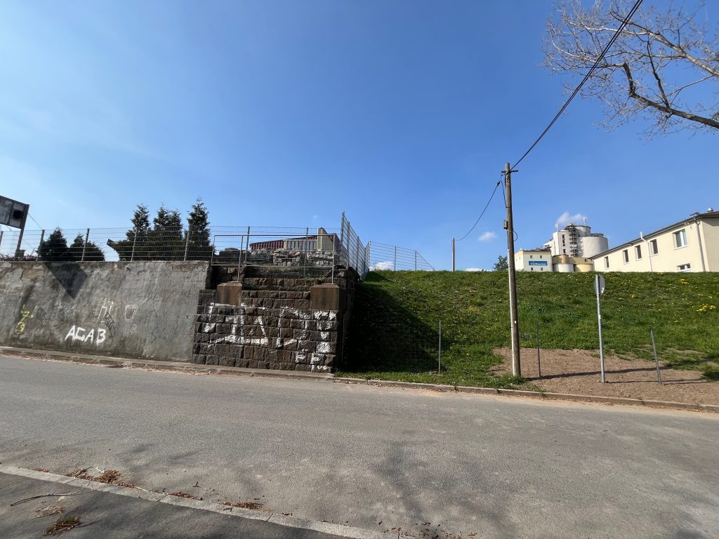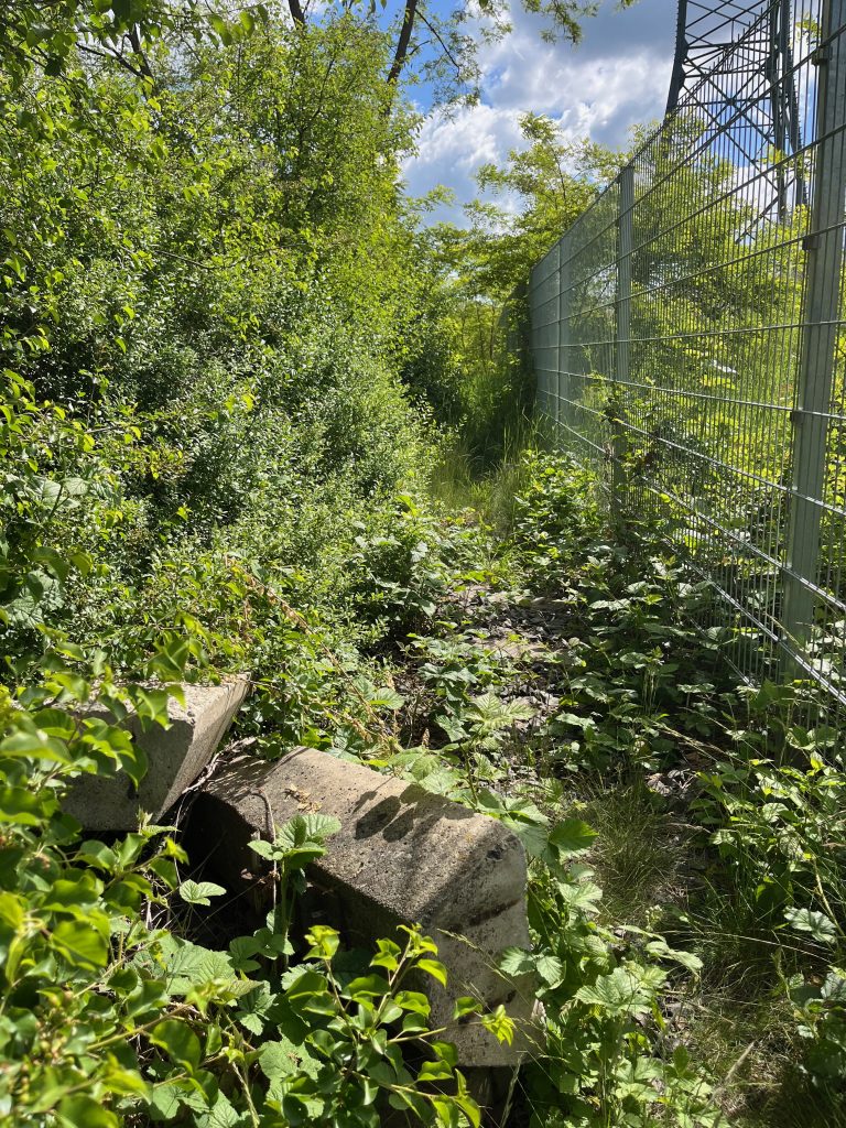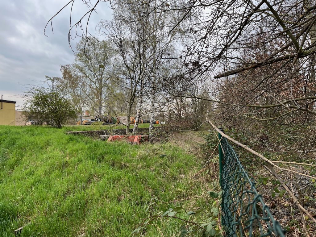 Der Bahndamm im Hintergrund ist noch vollständig erhalten, jedoch gänzlich von Bäumen und Sträuchern überwachsen. Ein begehen ist aktuell nicht möglich, weshalb ich Bilder von weiter unten aufnehmen musste.