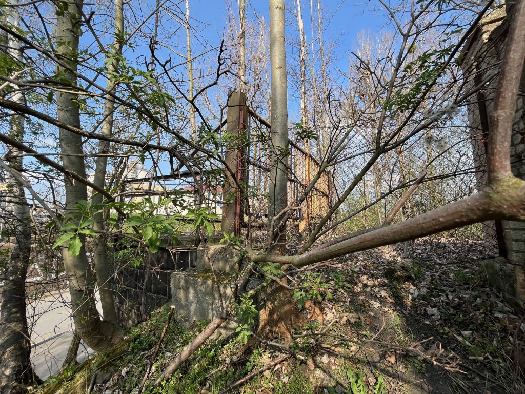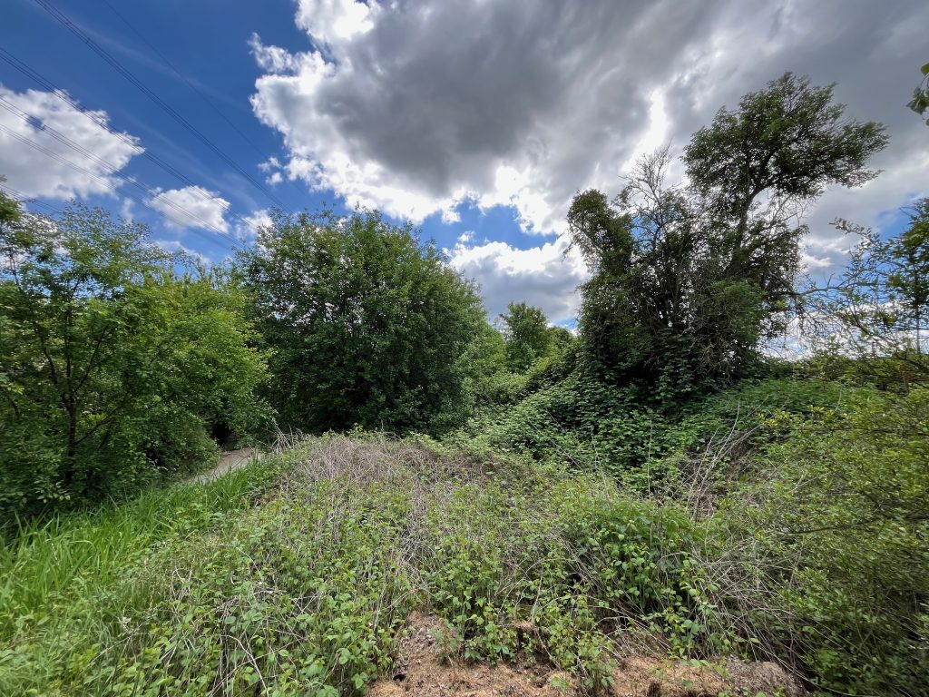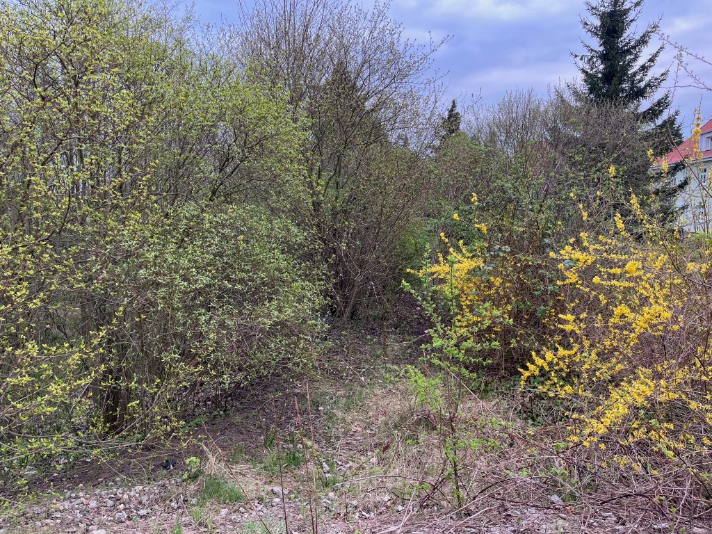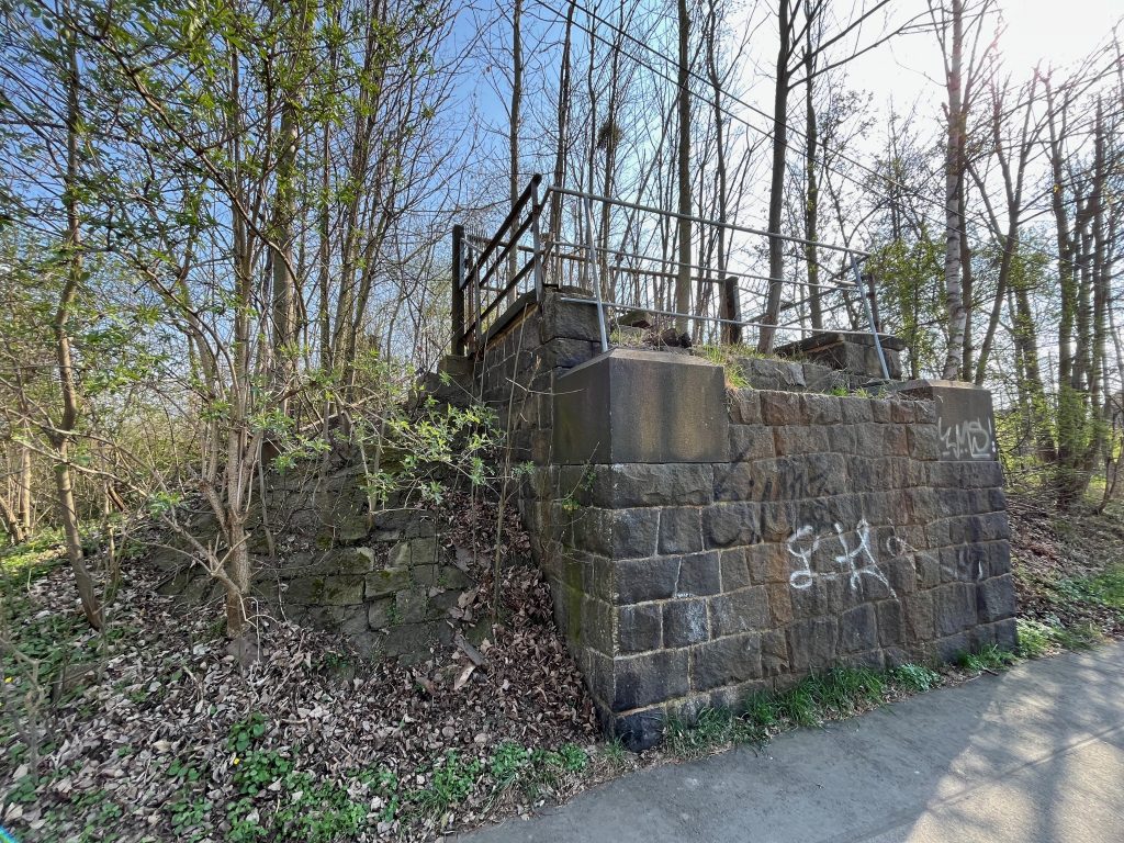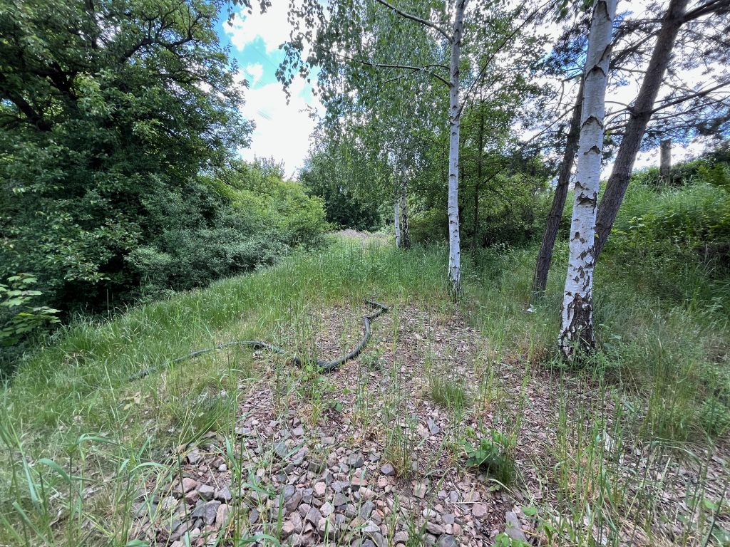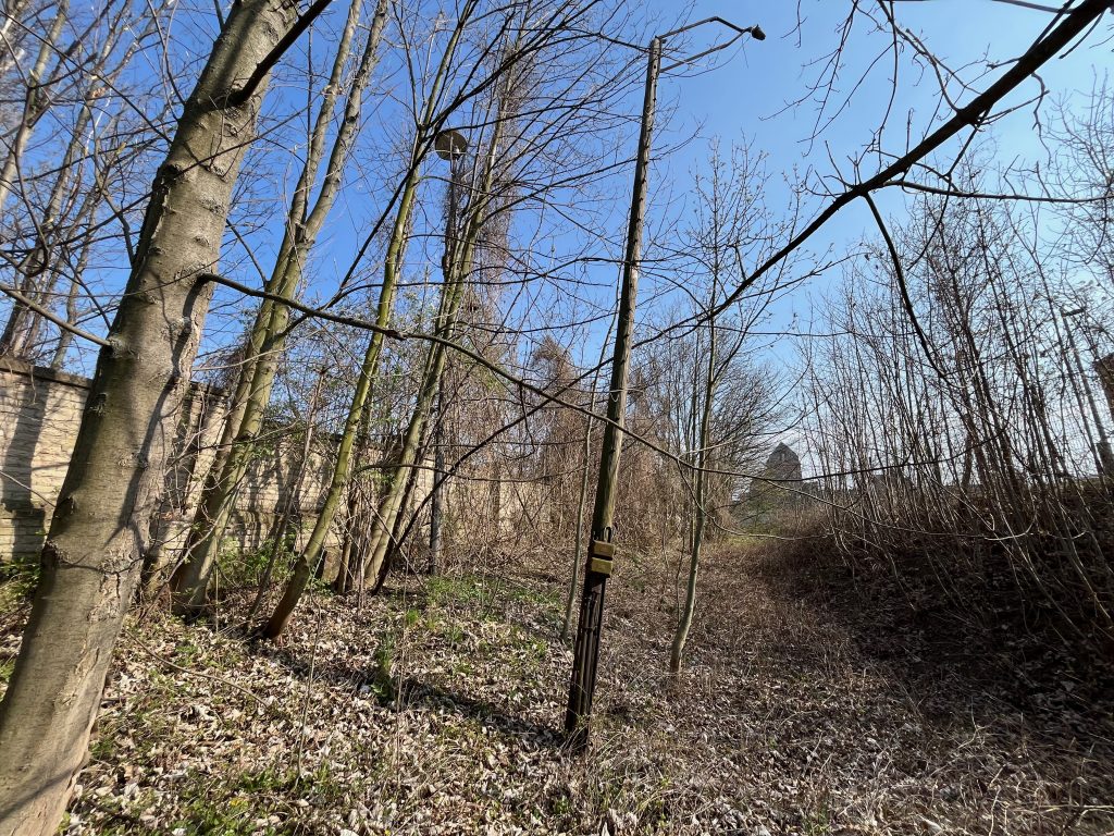 Der Bahndamm im Hintergrund ist noch vollständig erhalten, jedoch gänzlich von Bäumen und Sträuchern überwachsen. Ein begehen ist aktuell nicht möglich, weshalb ich Bilder von weiter unten aufnehmen musste.